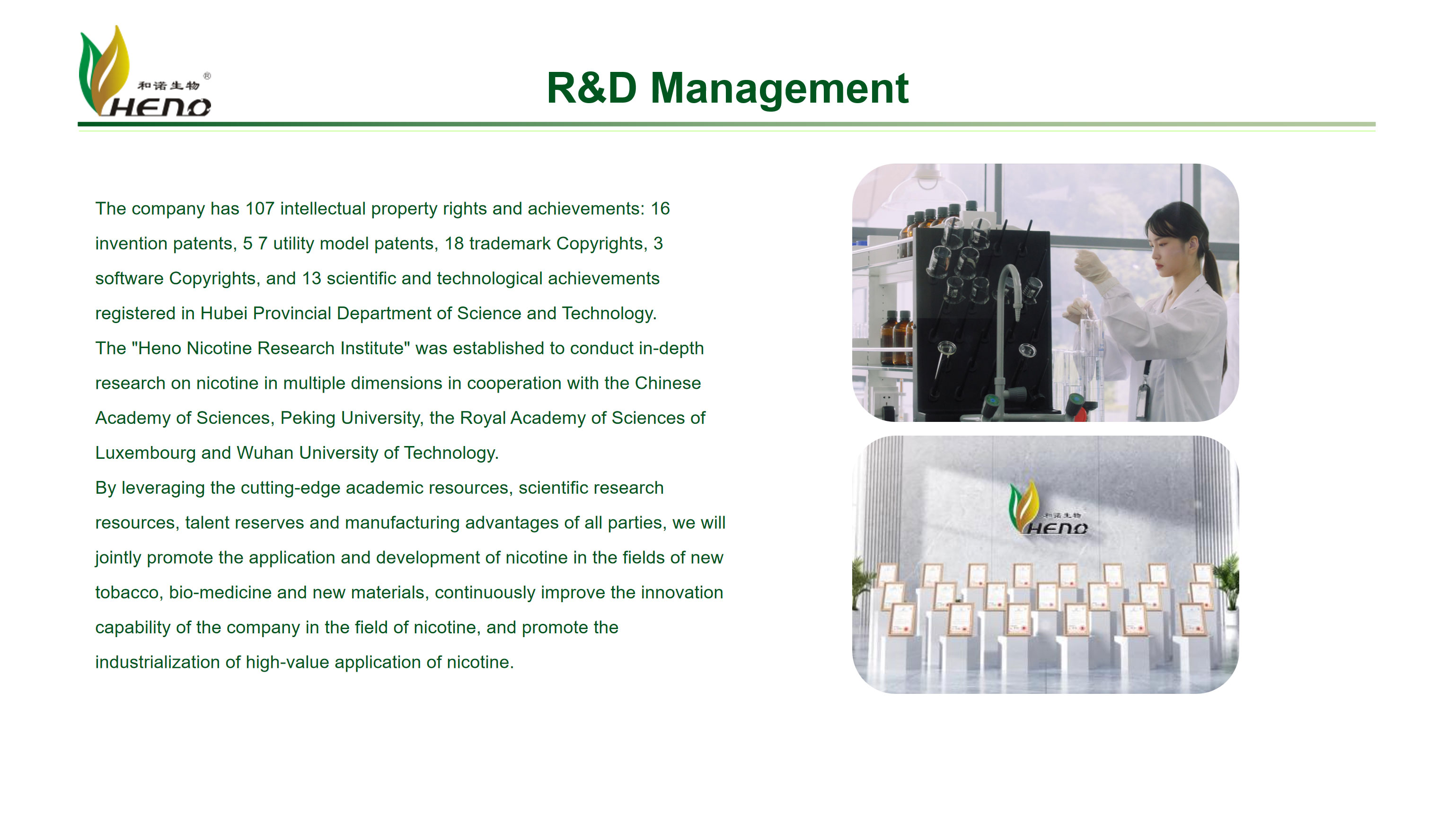2011년에 설립된 Hubei HENO Bio-Engineering Co., Ltd.는 선도적인 중국의 기술 및 자원 중심 기업으로 전문화됨 담배 폐기물의 순환 활용. 14년간의 헌신적인 노력 끝에 개발, 우리는 다음과 같이 인정되었습니다. 국가 "소형거인" 기업(고도로 전문화되고 혁신적인 중소기업을 위한 권위 있는 명칭) 기업, 국가 지식 재산권 우대 기업 및 도립 녹색 공장. 107건의 지적재산권을 보유하고 있습니다. 16건의 발명 특허를 포함합니다. 당사 브랜드 "HENO Bio"는 여러 국가에서 사용되고 있으며 후베이 우수 상표로 유명합니다.